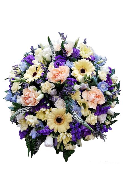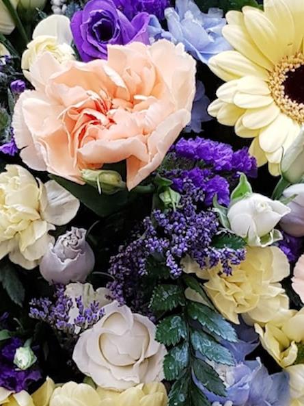 A 10” posy made in shades of blues, purples, lemons, whites with a hint of peach.