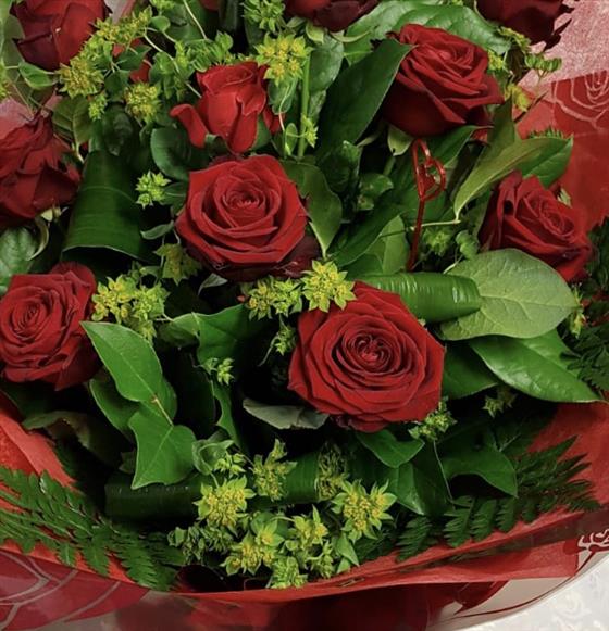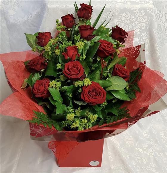 A front facing display of 11 best quality velvety red roses and 1 artificial red rose mingled with mixed foliage presented with a complementary wrap.