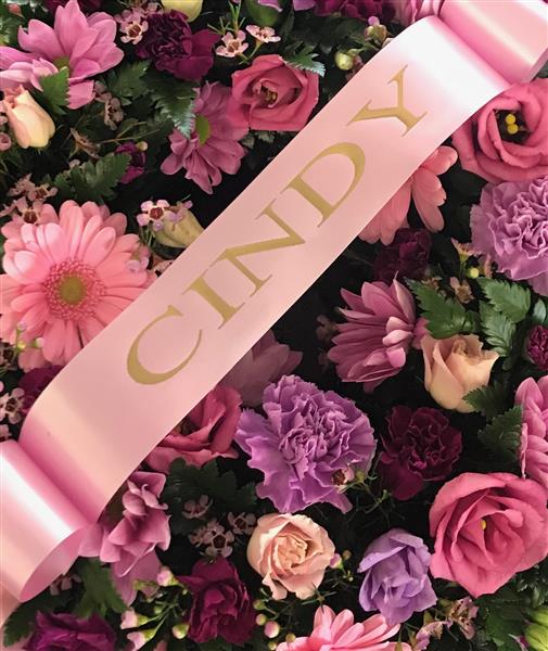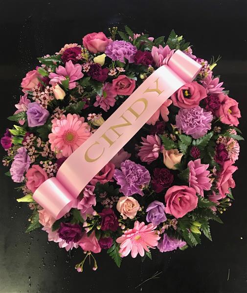Pink & Lilac Wreath with Funeral Sash zoom 2Pink & Lilac Wreath with Funeral Sash zoom 3