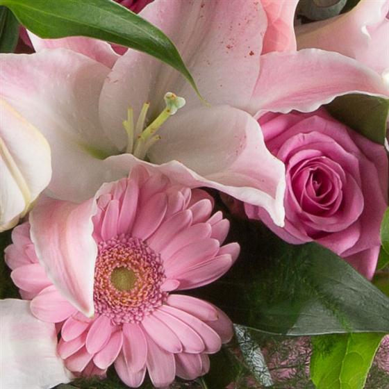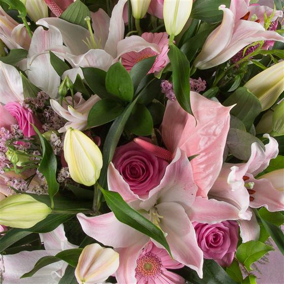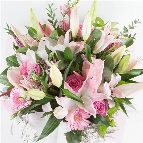 A sophisticated array of fragrant pink lilies, lime foliage, gerberas and roses make this a stylish choice.