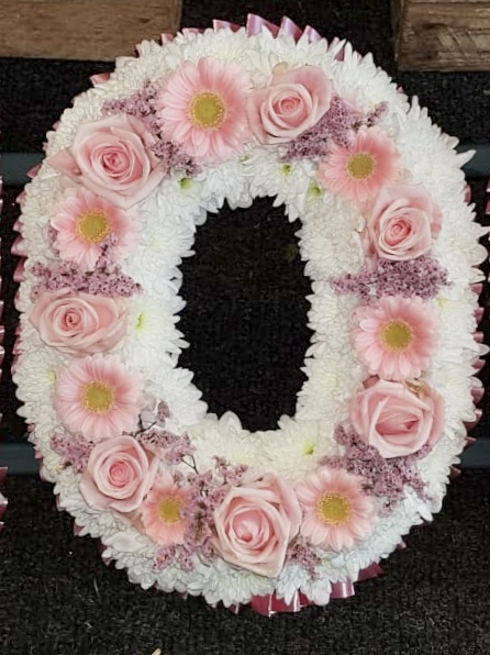 Lettering with either a ribbon or foliage edge with an outline of white chrysanthemums and a centre of alternating roses and gerberas, complimented with a delicate filler flower.