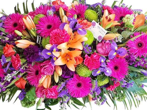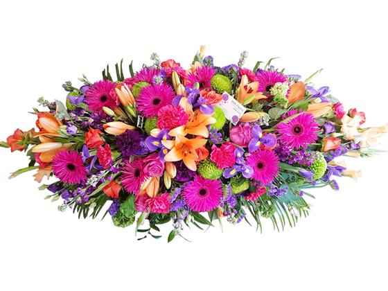 In vibrant colours, this casket spray contains a bright mixture of flowers.